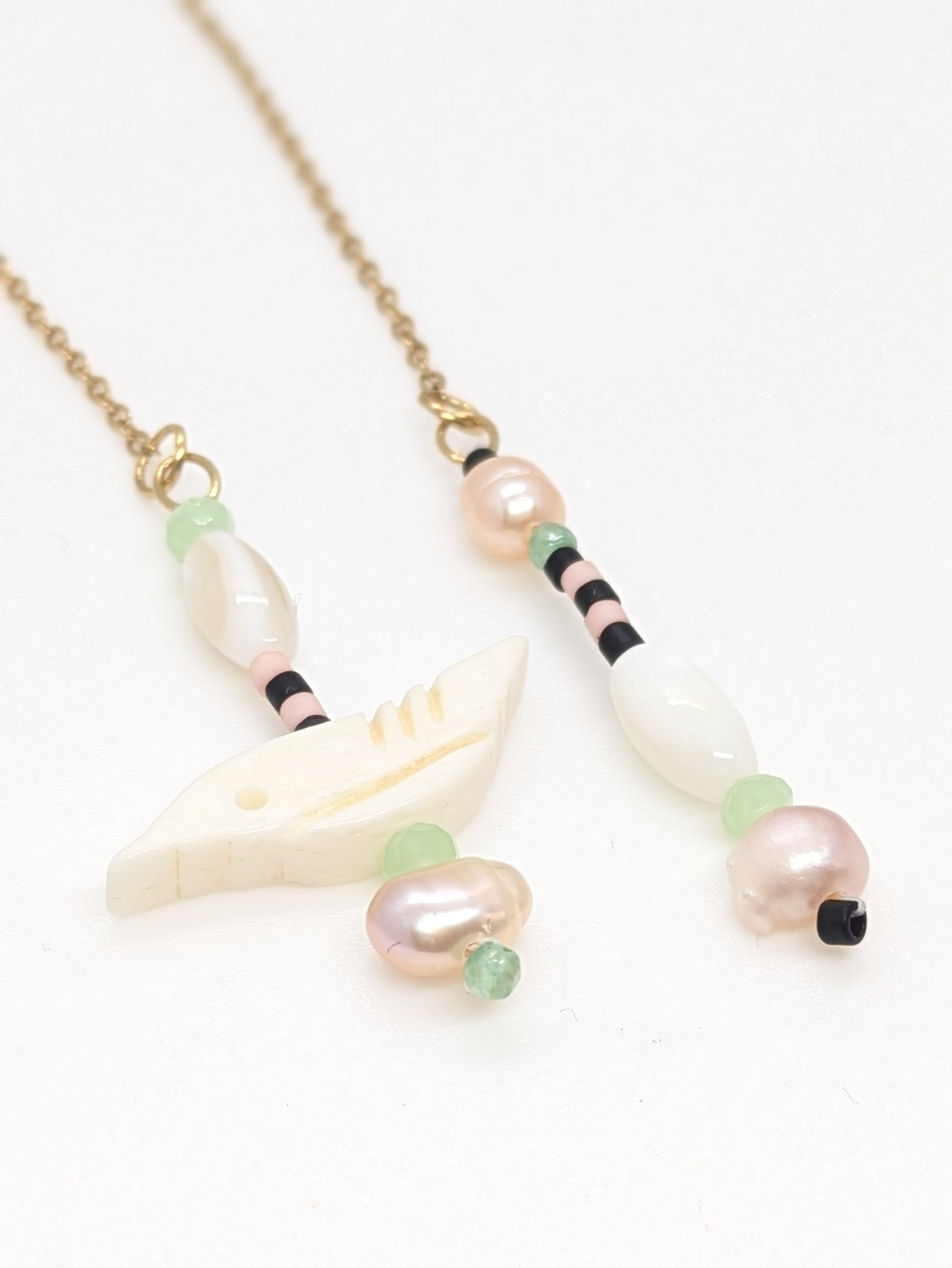 Boucles fils avec petits oiseaux sculptés en os, perles d'eau douce, Jade, perles Miyuki